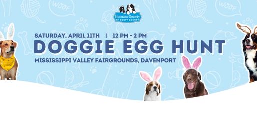 Join us for our Doggie Egg Hunt on April 11 at the Mississippi Valley Fairgrounds from 12pm-2pm! Bring your pup for a fun-filled afternoon of treat hunts, vendors, prizes, and community fun — all while supporting the animals at the Humane Society of Scott County.
